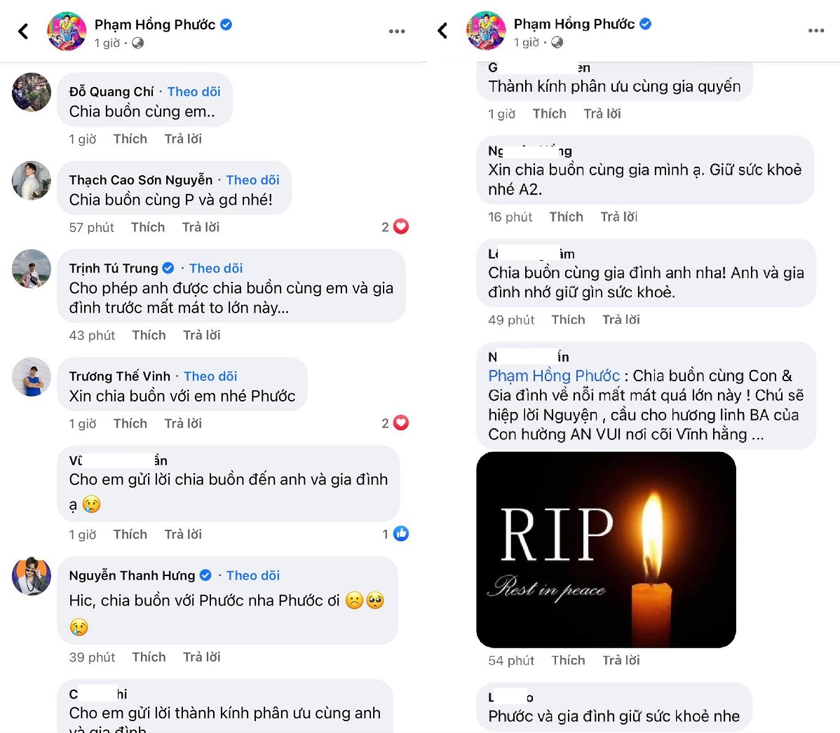 Chia sẻ của nam ca sĩ gây xúc động mạnh mẽ. Một loạt sao Việt và khán giả đều để lại bình luận chia buồn cùng Phạm Hồng Phước và gia đình. S.T Sơn Thạch xót xa: "Chia buồn cùng Phước và gia đình nhé!"; Trương Thế Vinh ngậm ngùi: "Xin chia buồn với em nhé Phước"; "Em xin chia buồn cùng anh và gia đình. Bác sống hiền và phúc đức lắm, chắc chắn sẽ được yên bình nơi chín suối... Anh và Bác gái với hai em mạnh mẽ lên nhé ạ!", một người quen chia sẻ.