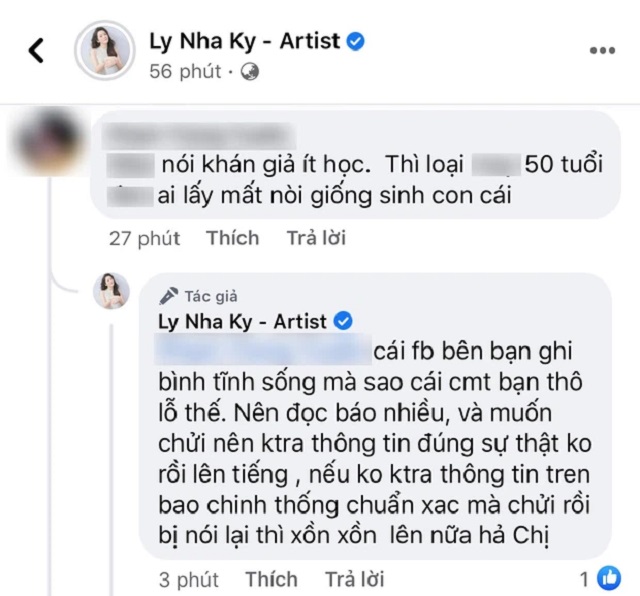 Tưởng chừng sự việc sẽ kết thúc ở đây nhưng vừa mới đây, khi đăng tải hình ảnh mới lên Facebook, cô lại bị 1 cư dân mạng tra hỏi về phát ngôn "khán giả ít học". Lý Nhã Kỳ lập tức gay gắt đáp trả: "Thấy facebook nhìn học hành cũng đàng hoàng mà sao chữ nghĩa đọc thiếu trước thiếu sau vậy? Muốn ghen tị hay hại người ta nên dùng cái đầu trước khi dùng cái miệng và tay đi cào bàn phím nha".