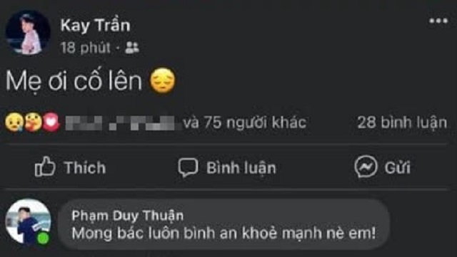 Tối 26/9, mạng xã hội xôn xao khi Kay Trần bất ngờ đăng tải dòng trạng thái gây lo lắng: “Mẹ ơi cố lên”. Bài đăng của nam ca sĩ khiến nhiều bạn bè, khán giả không khỏi hoang mang, không biết điều gì đang xảy ra với mẹ anh. Dưới phần bình luận, Jun Phạm động viên: "Mong bác luôn bình an, khỏe mạnh nè em". Hiện Kay Trần vẫn chưa lên tiếng về dòng trạng thái mới nhất của mình.