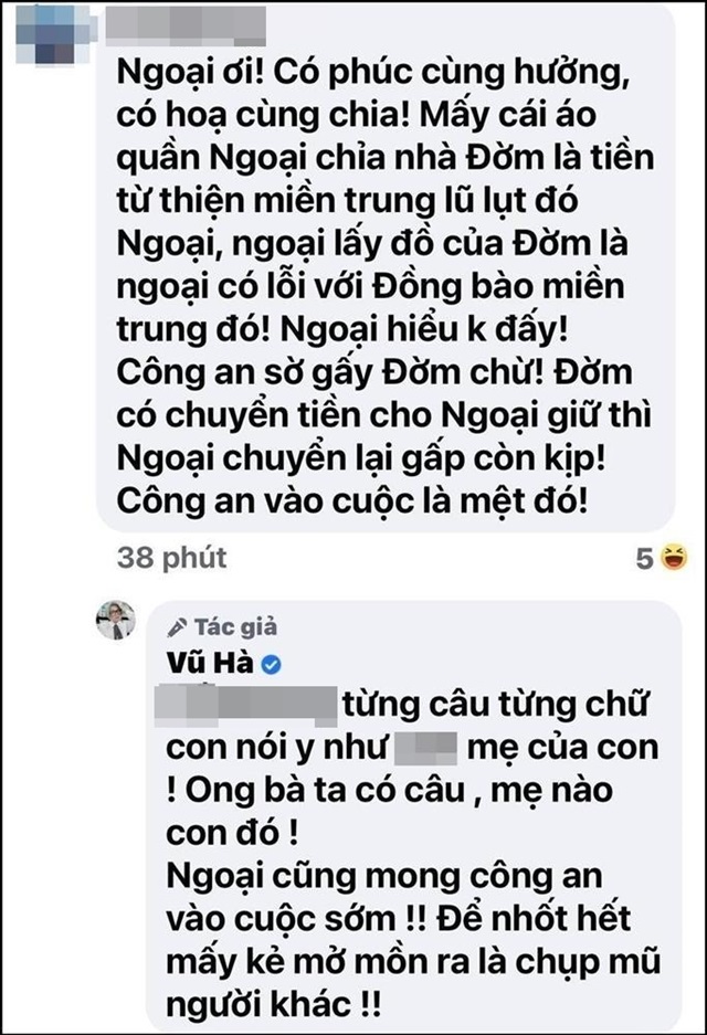 Một dân mạng lại mỉa mai chuyện Vũ Hà lấy đồ của Đàm Vĩnh Hưng chẳng khác gì có lỗi với người dân miền Trung, nên nhanh chóng chuyển lại trước khi công an vào cuộc. Vũ Hà lập tức nói: “Từng câu từng chữ con nói y như *** mẹ của con! Ông bà ta có câu, mẹ nào con đó! Ngoại cũng mong công an vào cuộc sớm! Để nhốt hết mấy kẻ mở mồm ra là chụp mũ người khác!”.