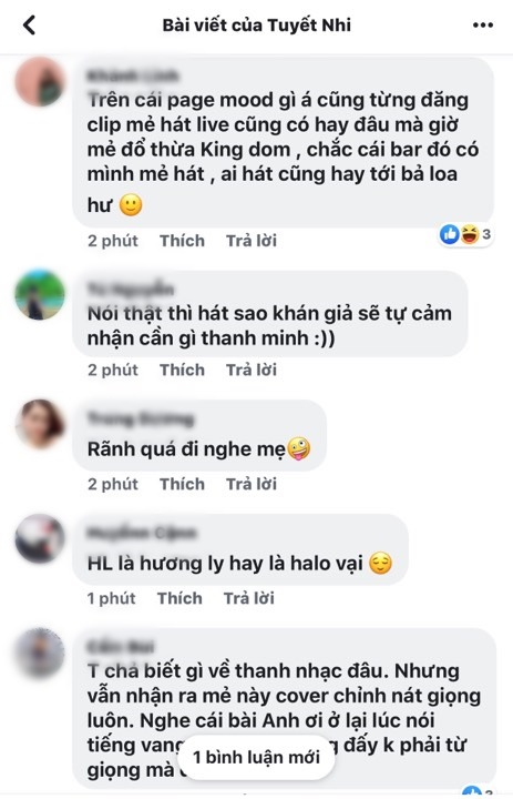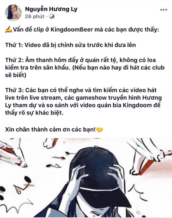 Sự việc này chưa dừng lại ở đây, khi chiều ngày 10/10, Hương Ly đã lên tiếng về vụ việc bằng một status trên trang cá nhân Facebook. Cụ thể, cô nàng thanh minh cho clip hát live ở KingdoomBeer. Hương Ly cho hay clip hát live đã bị chỉnh sửa khi đưa lên, âm thanh của quán rất tệ, không có loa kiểm tra trên sân khấu…