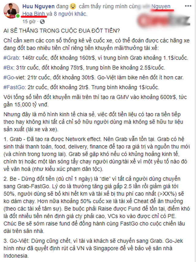 Mới đây, CEO Fastgo - một startup trong hệ sinh thái NextTech của Shark Bình vừa đăng tải trên trang facebook cá nhân về công chuyện "Ai sẽ thắng trong cuộc đua đốt tiền" thậm chí còn công bố tổng tiền của một loạt đối thủ trong lĩnh vực gọi xe Việt Nam.