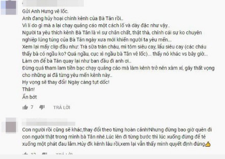 "Gửi anh Hưng Vlog (ý chỉ con trai bà Tân). Anh đang hủy hoại chính kênh của bà Tân rồi. Vì lý do gì anh lại chạy quảng cáo một cách quá lố và dày như vậy. Người xem yêu thích kênh của bà Tân vì sự chân chất, thật thà.