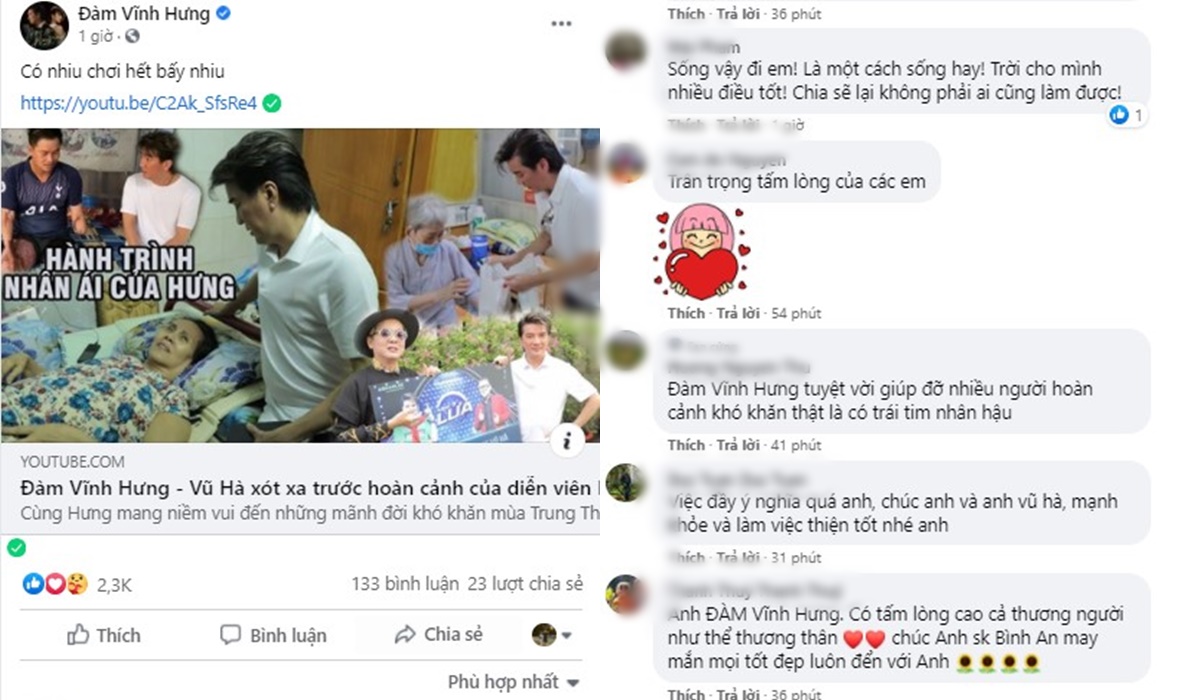 "Thương Đàm Vỉnh Hưng và Vũ Hà nhiều lắm. Chúc đôi bạn này thật nhiều sức khỏe niềm vui và hạnh phúc và quan trọng nhất là thật nhiều tiền để làm nhiều việc quá ý nghĩa như thế này. Tất cả mọi người luôn yêu thương 2 bạn!", "Sống thì phái biết sẽ chia cảm ơn Đàm Vĩnh Hưng, Vũ Hà đã bỏ công sức thời gian làm những việc có ý nghĩa mong rằng mọi người cùng chung sức của ít lòng nhiều giúp đỡ những hoàn cảnh khó khăn vì một con én ko làm được mùa xuân, một lần nữa cảm ơn ngoại Vũ Hà, Đàm Vĩnh Hưng nhiều sức khỏe và thành công trên con đường ca hát" - Khán giả dành lời khen cho nghĩa cử của Đàm Vĩnh Hưng và Vũ Hà.