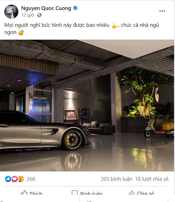 Theo đó, bức ảnh của Cường Đô La đăng tải chụp lại một góc trong gara ô tô được thông với phòng khách. Chỉ một khoảnh khắc nhưng Cường Đô La đã khoe khéo được xế hộp Mercedes-AMG GT R 2020 mới tậu với giá 11,59 tỷ đồng, chiếc Vespa Primavera phiên bản đặc biệt Sean Wotherspoon mà anh mua tặng bà xã có giá 135 triệu đồng (Việt Nam chỉ có 50 mẫu) và một góc phòng khách đầy sang trọng.