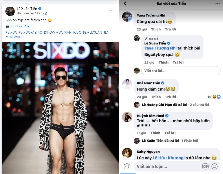 Thậm chí, nữ diễn viên ‘Em chưa 18” Kaity Nguyễn còn tiết lộ phần trình diễn của Lê Xuân Tiền nhận được nhiều tiếng reo hò ngay tại show thời trang của Đỗ Mạnh Cường. Nữ diễn viên Khả Như - đàn em thân thiết được Trường Giang coi như em gái còn chia sẻ dưới bài viết rằng hình ảnh của Lê Xuân Tiền quá nóng bỏng khiến cô băn khoăn có nên thả bình luận hay không.