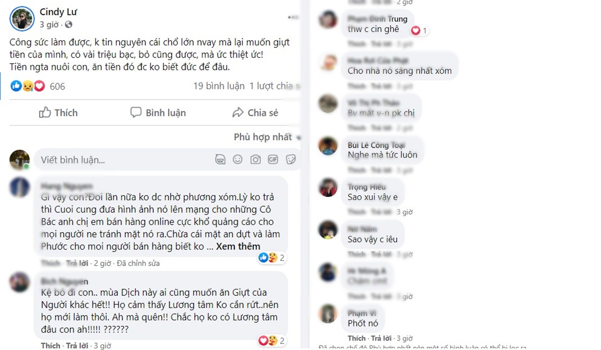 Trước dòng trạng thái của Bảo Ngọc, nhiều người thân quen của cô đã vào động viên bà mẹ trẻ đơn thân: “Kệ bỏ đi con.. mùa dịch này ai cũng muốn ăn giựt của người khác hết!! Họ cảm thấy lương tâm không cắn rứt..nên họ mới làm thôi. Mà quên!! Chắc họ không có Lương tâm đâu con ạ!”, “10 năm kết thúc bằng chữ cạn lời em à.!”, “Thương chị quá!”...