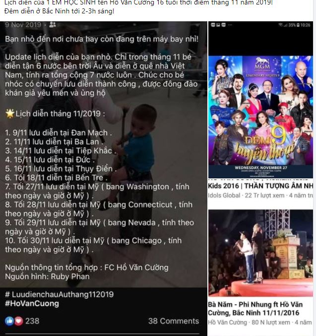 Sau đó, vào sáng 27/10, một nhóm kín đã xuất hiện bài đăng chia sẻ về lịch diễn dày đặc của Hồ Văn Cường từ lúc em mới còn đi hát: “Lịch diễn của 1 EM HỌC SINH tên Hồ Văn Cường 16 tuổi thời điểm tháng 11 năm 2019!