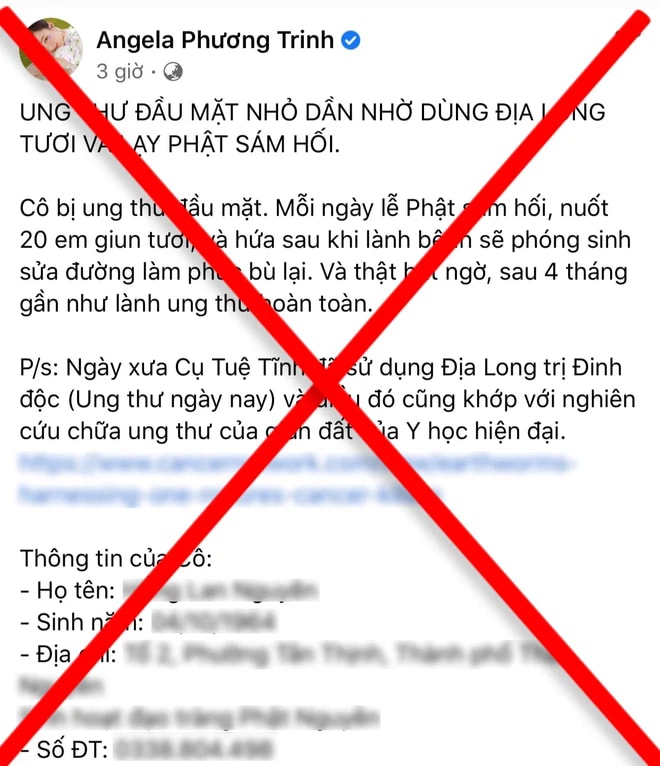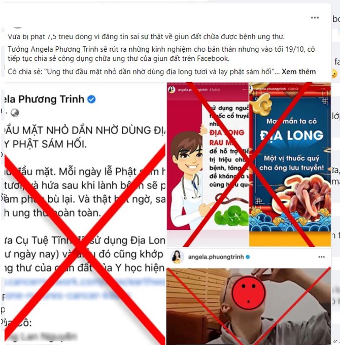 Cụ thể, tối 19/10, Angela Phương Trinh tiếp tục chia sẻ bài viết ca ngợi công dụng chữa ung thư của giun đất trên Facebook trong đó có câu: "Ung thư đầu mặt nhỏ dần nhờ dùng địa long tươi và lạy phật sám hối".