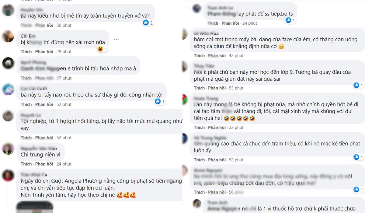 Ai nấy tỏ ra bức xúc, khi Angela Phương Trinh truyền bá những thông tin liên quan đến sức khỏe nhưng lại không dựa trên 1 cơ sở khoa học nào. Nhiều ý kiến cho rằng Angela Phương Trinh đang có những động thái thách thức dư luận mặc dù cô là người có sức ảnh hưởng đến công chúng.