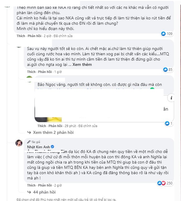Ngay lập tức, Nhật Kim Anh cũng đã để lại bình luận giải thích về vấn đề này: “Dạ. lúc đó KA đi chung nên quy tiền về một mối cho dễ làm việc (chứ cứ đi mỗi thôn mỗi huyện bà con thì đông KA và anh Nghĩa lại mất công ngồi chia ra ạh, trong khi tiền của MTQ thì giúp bà con ở đâu thì cũng là giúp và tiền MTQ BÊN KA hay bên anh Nghĩa thì cũng quy về gửi tận tay bà con khó khăn thôi ạ, và KA cũng đã đăng thông báo rõ là như vậy rồi mà ạh !”
