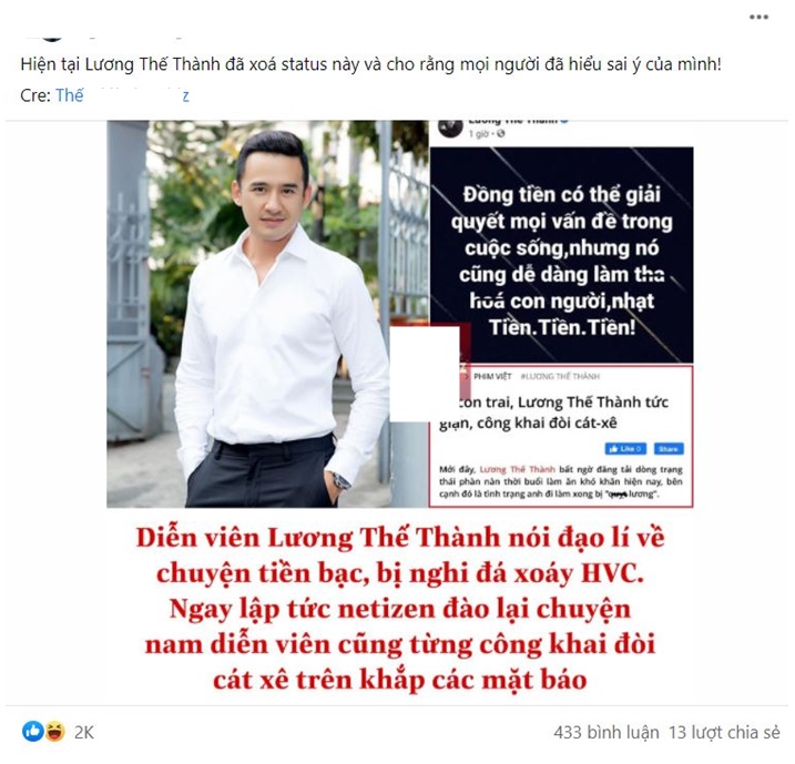 Vào tối 11/10, Nam diễn viên Lương Thế Thành đã gây xôn xao dư luận khi đăng tải một dòng trạng thái thể hiện sự bức xúc xung quanh vấn đề tiền bạc: “Đồng tiền có thể giải quyết mọi vấn đề trong cuộc sống,nhưng nó cũng dễ dàng làm tha hoá con người,nhạt