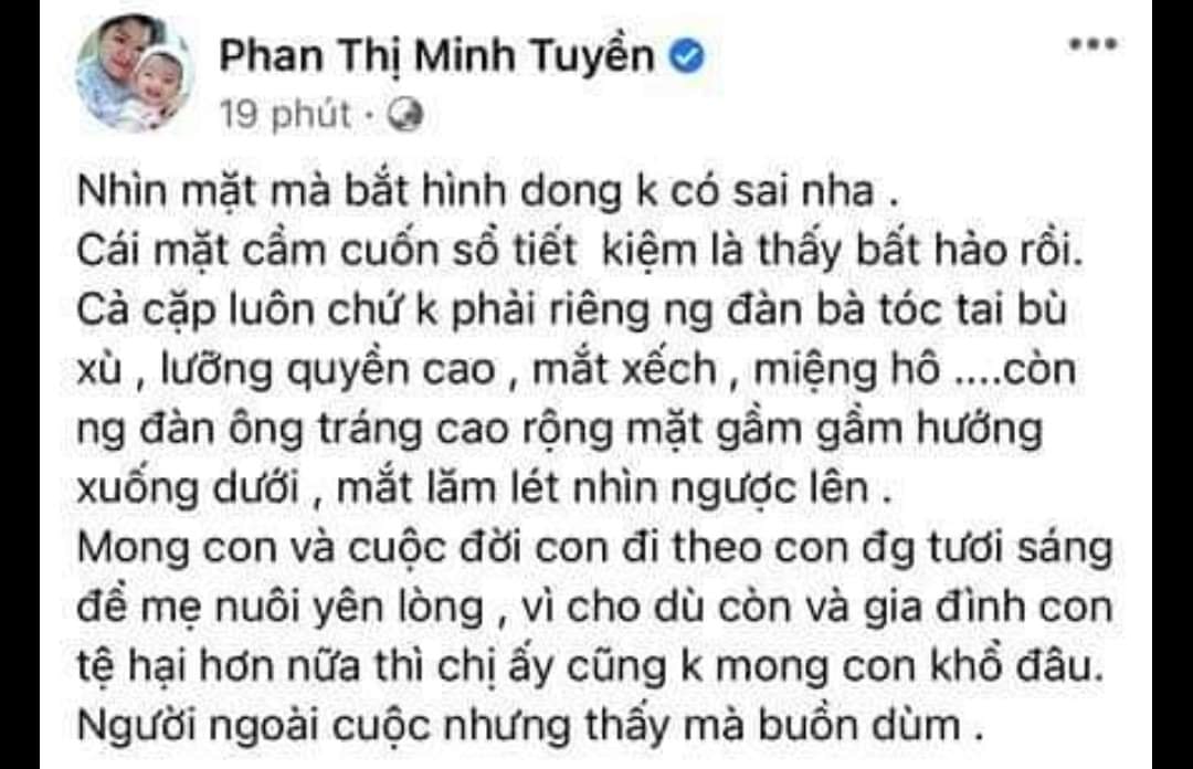 Cụ thể, trong bài đăng này, Minh Tuyền đề cập đến vấn đề tướng mạo của gia đình Hồ Văn Cường: “Nhìn mặt mà bắt hình dong không có sai nha. Cái mặt cầm cuốn sổ tiết kiệm là thấy bất hảo rồi. Cả cặp luôn chứ không phải người đàn bà tóc tai bù xù, lưỡng quyền cao, mắt xếch, miệng hô...còn người đàn ông trán cao rộng mặt gầm gầm hướng lên xuống dưới, mắt lăm lét nhìn ngược lên.