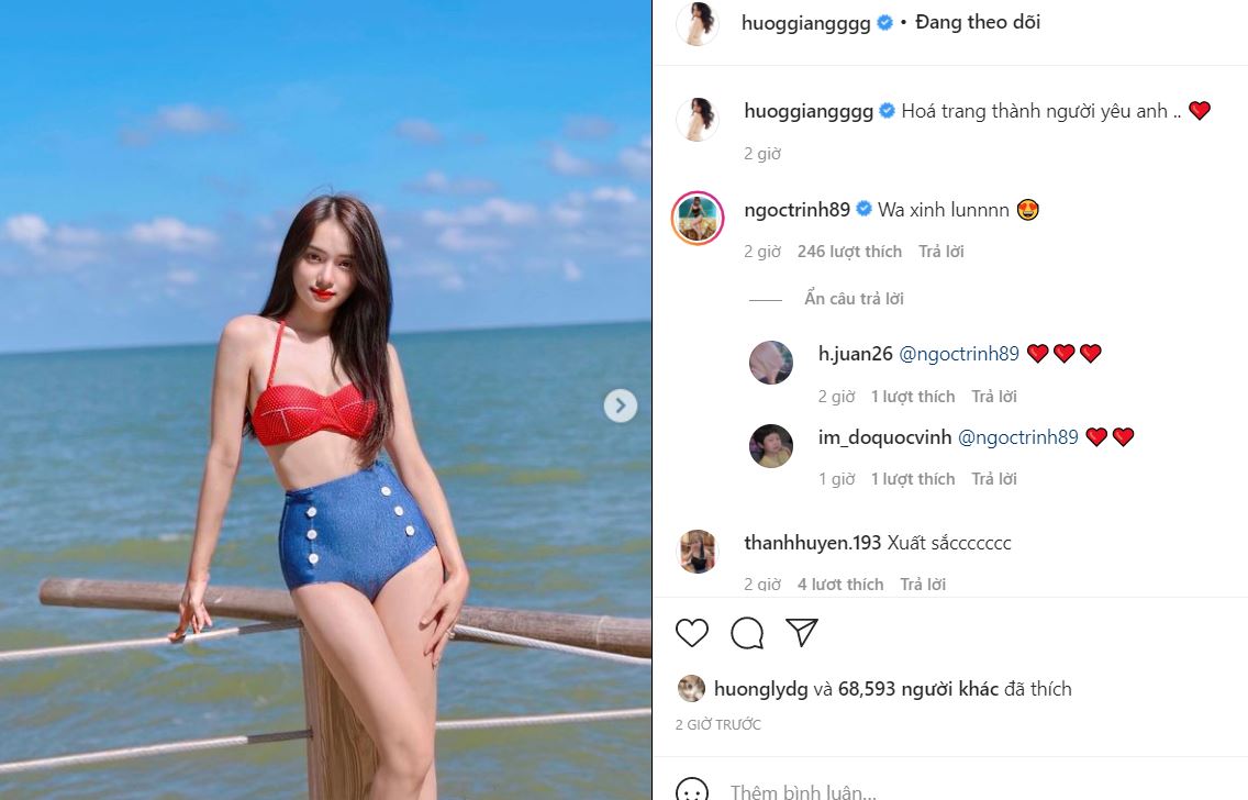 Thân hình thon gọn, bốc lửa của Hương Giang sau thời gian ở ẩn khiến nhiều người trầm trồ. Ngay đến cả, ‘nữ hoàng nội y ‘ Ngọc Trinh cũng phải thể hiện sự bất ngờ và lời khen dành cho vẻ ngoài ấn tượng của người chị em thân thiết. “Quá xinh luôn!” - Ngọc Trinh để lại bình luận.