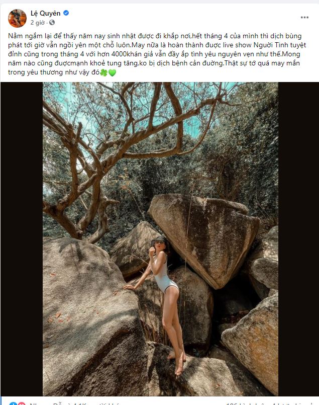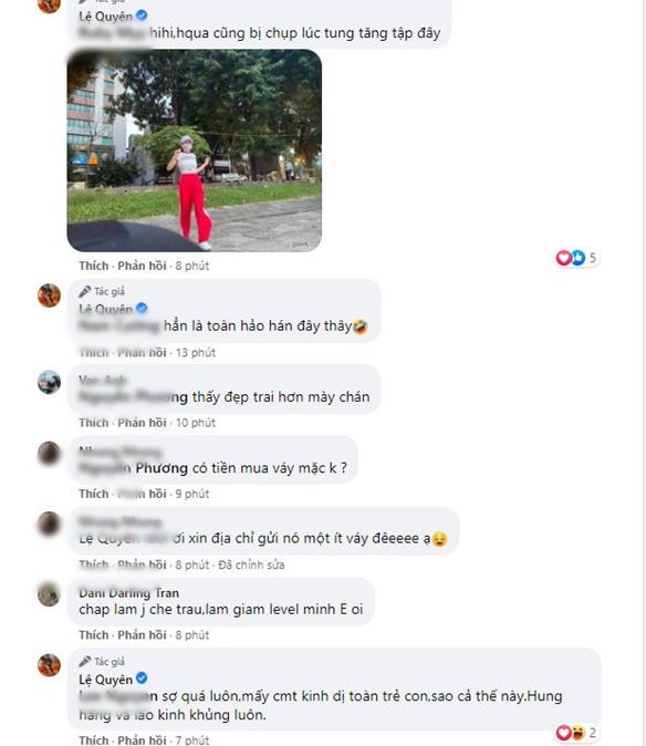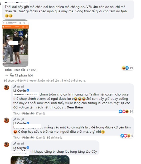Theo đó, 1 tài khoản đã đăng tải hình ảnh chụp lén Lệ Quyên của 1 trang tin và sau đó mỉa mai về chiều cao và vóc dáng thật của nữ nghệ sĩ: “Thời đại bây giờ mà chân dài bao nhiêu mà chẳng đc.. Vếu 4m còn đc nói chi mà chân dài 3m2 gì ở đây khéo nịnh quá mấy má.. Sống thực tế tý đi cho tâm nó tịnh.. “