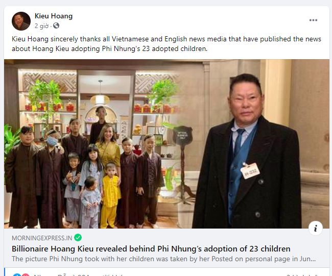 Theo đó, ông Hoàng Kiều đã chia sẻ 1 bài báo của trang Morning Express với tiêu đề: “Billionaire Hoang Kieu revealed behind Phi Nhung’s adoption of 23 children” (tạm dịch: “Tỷ phú Hoàng Kiều tiết lộ đằng sau câu chuyện nhận nuôi 23 người con nuôi của Phi Nhung”.