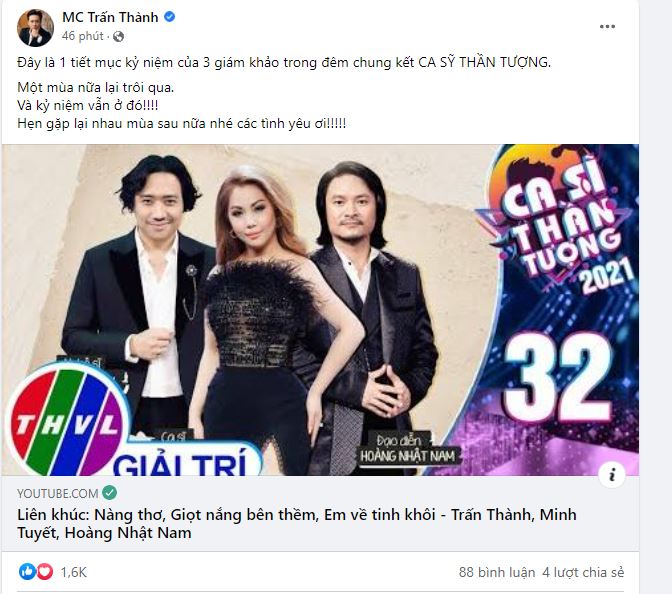 Mới đây nhất, vào ngày 25/10, Trấn Thành đã chia sẻ đường link youtube phần trình diễn của mình khi làm giám khảo cho chương trình ‘ca sĩ thần tượng’: