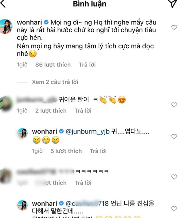 Tuy nhiên, ngay lập tức, Hari Won đã để lại bình luận khẳng định rằng cô không có ý gì tiêu cực khi chia sẻ cuộc hội thoại này. Thậm chí còn cho biết theo văn hóa Hàn Quốc thì cuộc hội thoại trên mang ý nghĩa hài hước và mong mọi người tiếp nhận theo hướng tích cực: “Mọi người ơi, người Hàn Quốc thì nghe mấy câu này là rất hài hước chứ không nghĩ tới chuyện tiêu cực hén. Nên mọi người hãy mang tâm lý tích cực mà đọc nhé!”