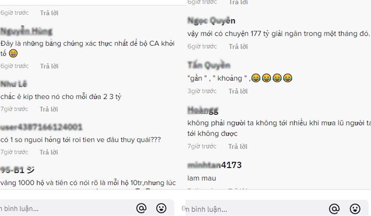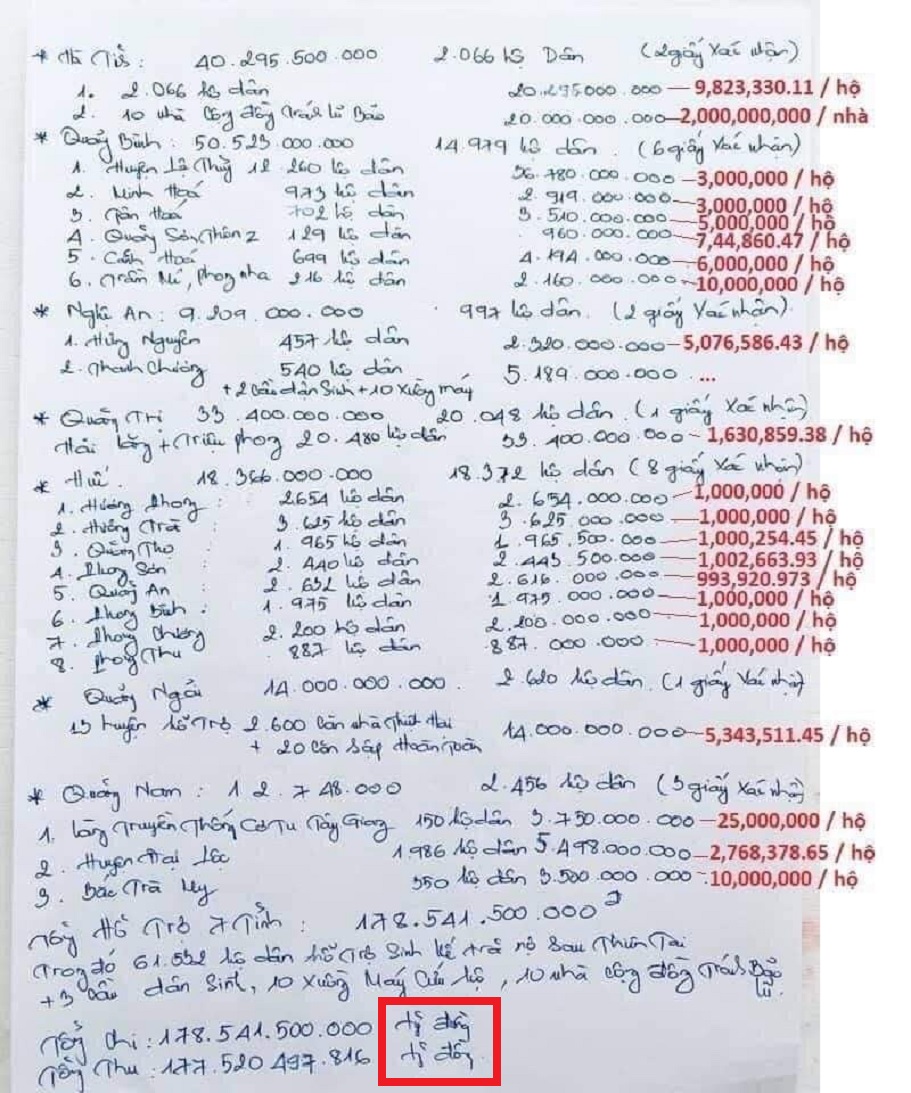Tài khoản đăng lại clip này cũng để cập đến trong bản kê khai A4 của Thủy Tiên ghi chú chỉ phát cho 702 hộ khi đi cứu trợ ở xã Tân Hóa, huyện Minh Hóa, tỉnh Quảng Bình: “TRÊN TỜ A4 CÔ KHAI THÌ CHỈ PHÁT CHO 702 HỘ, HỘ 5 TRIỆU MÀ TRÊN LIVE CÔ NỔ LÚC LIVESTREAM THÌ GẦN 1000 NGƯỜI, LÚC THÌ 1000 NGƯỜI. THẬT KHÓ HIỂU À ?”.