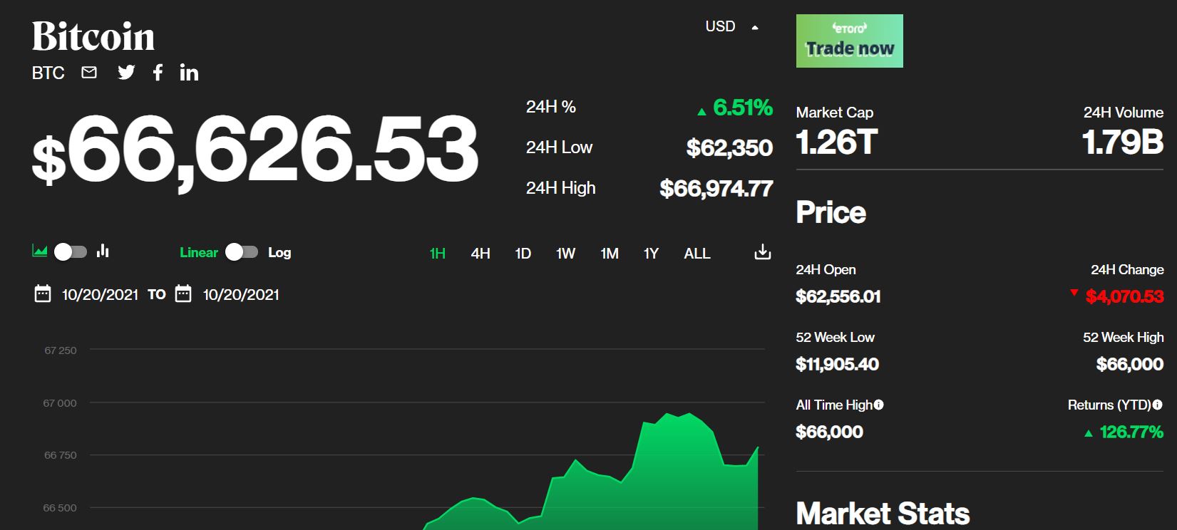Vào tối 20/10, giá Bitcoin đã cán mốc cao nhất từ trước đến nay khi có giá trị lên tới hơn 66.000 đô la. Đây là con số phá vỡ các kỷ lục được thiết lập vào tháng 3 và tháng 4 năm nay. Từ đầu tháng 10, giá của Bitcoin đã đạt khoảng 43.000 đô la và đã tăng gần một nửa giá sau đó. Bitcoin lập đỉnh mới cao nhất thời đại trong bối cảnh ProShares Bitcoin Strategy ETF, quỹ giao dịch trao đổi liên quan đến bitcoin đầu tiên được giao dịch tại Hoa Kỳ, ra mắt vào thứ Ba (19/10).