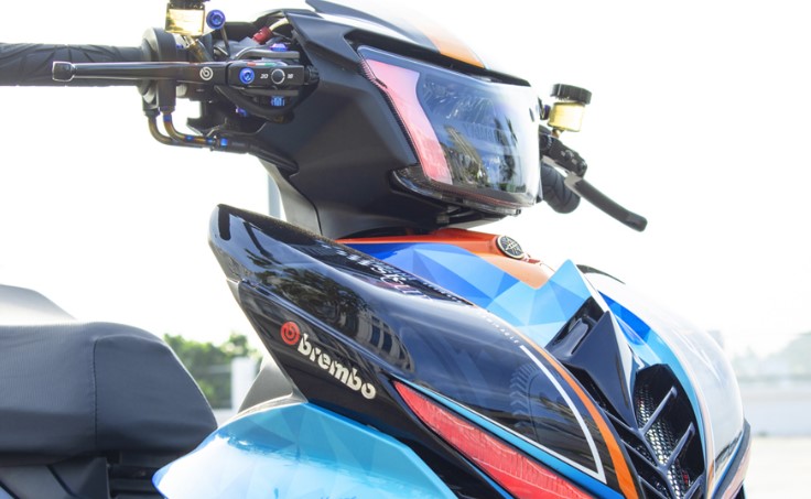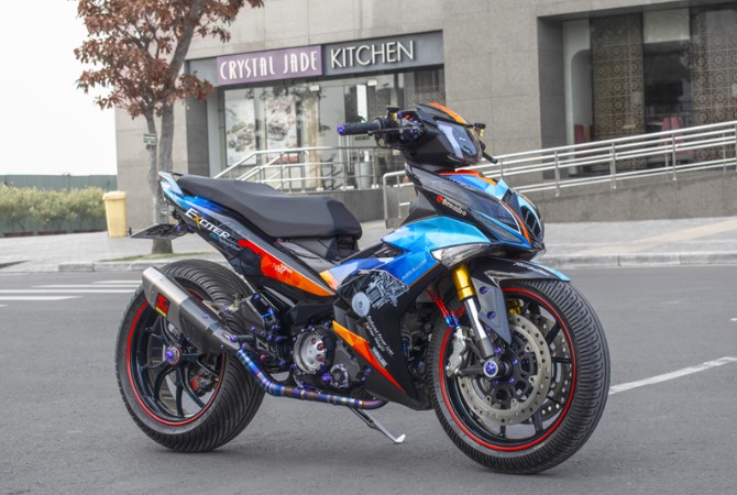 Chiếc xe vẫn giữ được hình dáng nguyên bản của Exciter 150. Dàn mũ của xe được sơn air brush cao cấp theo tông màu xanh - cam. Phần đầu xe được chế mũ theo cảm hứng từ phần lưới tản nhiệt trên ôtô giúp xe trông dữ dằn hơn. Phần đèn xe nguyên bản được thay thế bằng đèn LED 2 tầng kết hợp với đèn LED định vị theo phong cách Audi.