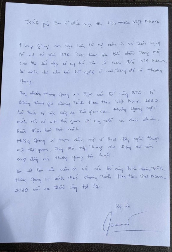 Đáng nói, bài đăng còn đi kèm với thư tay xin lỗi của Hương Giang. Nhiều người cho rằng việc Hương Giang rút khỏi đêm diễn này là vì áp lực đến từ những antifan khi những người này liên tục thể hiện thái độ phản đối với sự xuất hiện của nàng hậu chuyển giới.