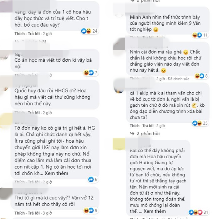 Nhiều người cho rằng bức thư xin lỗi của Hương Giang thiếu tôn trọng BTC: “Rất có thể đây không phải đơn mà Hoa hậu chuyển giới Hương Giang tự nguyện viết, mà do áp lực từ ban tổ chức, nếu không tự rút thì sẽ thẳng tay gạch tên. Nên mới sinh ra cái đơn từ ‘ất ơ’ như thế này, không tôn trọng đoàn thể, mưu mô chống lại đoàn thể. Đến giờ này mà chị còn đòi lộng hành.”, “Nhìn chị viết thế này, em cảm thấy không tôn trọng BTC cho lắm. Em cũng thấy ngứa mắt nữa, không thì lần sau chị có thể nhờ em viết giùm cho cũng được. Em cũng chỉ có lời góp ý chân thành từ tận tâm can này thôi mong chị tiếp thu và sửa đổi ạ. Em thấy ekip của chị đang thiếu người làm bên soạn thảo văn bản thì phải. E không ứng cử đâu nhưng em nhắc nhở chị nên tuyển 1 người để làm công việc này để chị có thể thành công hơn ạ!”, “Đơn từ gì mà không có tiêu đề, ngày tháng năm, ký tên cũng không ghi rõ họ tên, chung quy là không có giá trị pháp lý”