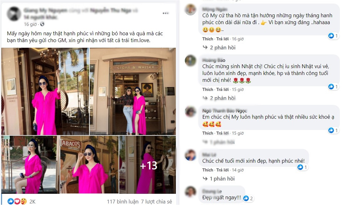 Mới đây, vào ngày 16/11, hoa hậu Giáng My bất ngờ đăng tải loạt hình khoe nhan sắc trẻ trung trên trang cá nhân với dòng trạng thái: “Mấy ngày hôm nay thật hạnh phúc vì những bó hoa và quà mà các bạn thân yêu gửi cho Giáng My, xin ghi nhận với tất cả trái tim.love.”
