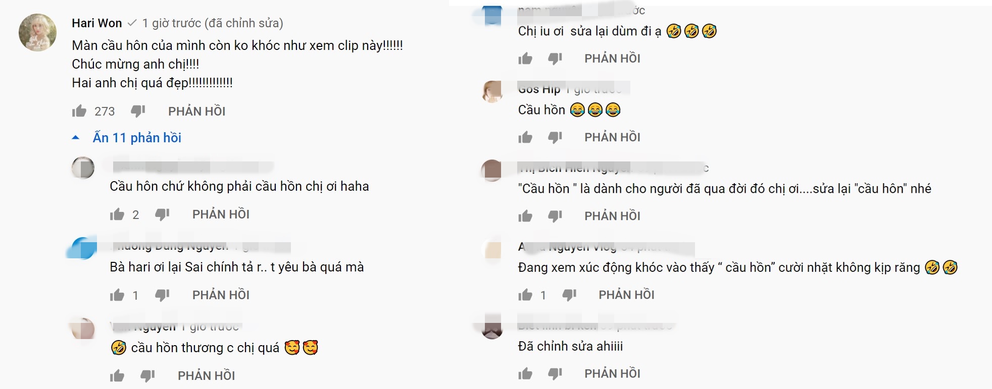 Tuy nhiên, dường như Hari Won đã có sự nhầm lẫn chính tả khi viết nhầm ‘cầu hôn’ thành cầu hồn. Nhiều khán giả đã phát hiện lỗi sai này và nhắc nhở bà xã Trấn Thành: “Cầu hôn chứ không phải ‘cầu hồn’ chị ơi! haha!”, “Bà Hari ơi lại sai chính tả rồi.. tui yêu bà quá mà!”, "Cầu hồn " là dành cho người đã qua đời đó chị ơi....sửa lại "cầu hôn" nhé! .