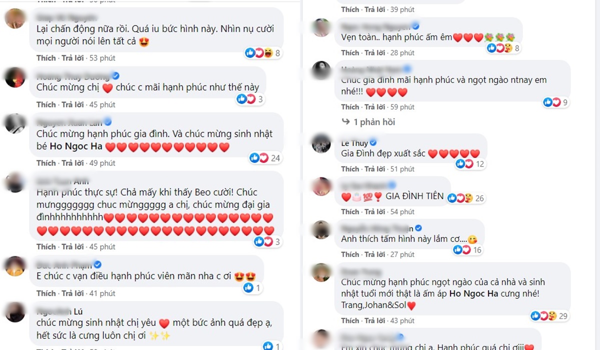 Cư dân mạng cũng thi nhau để lại những bình luận chúc mừng dưới bài đăng của Hồ Ngọc Hà: “Chúc gia đình mãi hạnh phúc và ngọt ngào thế này em nhé.”, “Vẹn toàn.. hạnh phúc ấm êm!”, “Chúc mừng sinh nhật chị yêu! Một bức ảnh quá đẹp ạ, hết sức là cưng luôn chị ơi!”, “Lại chấn động nữa rồi. Quá iu bức hình này. Nhìn nụ cười mọi người nói lên tất cả’.