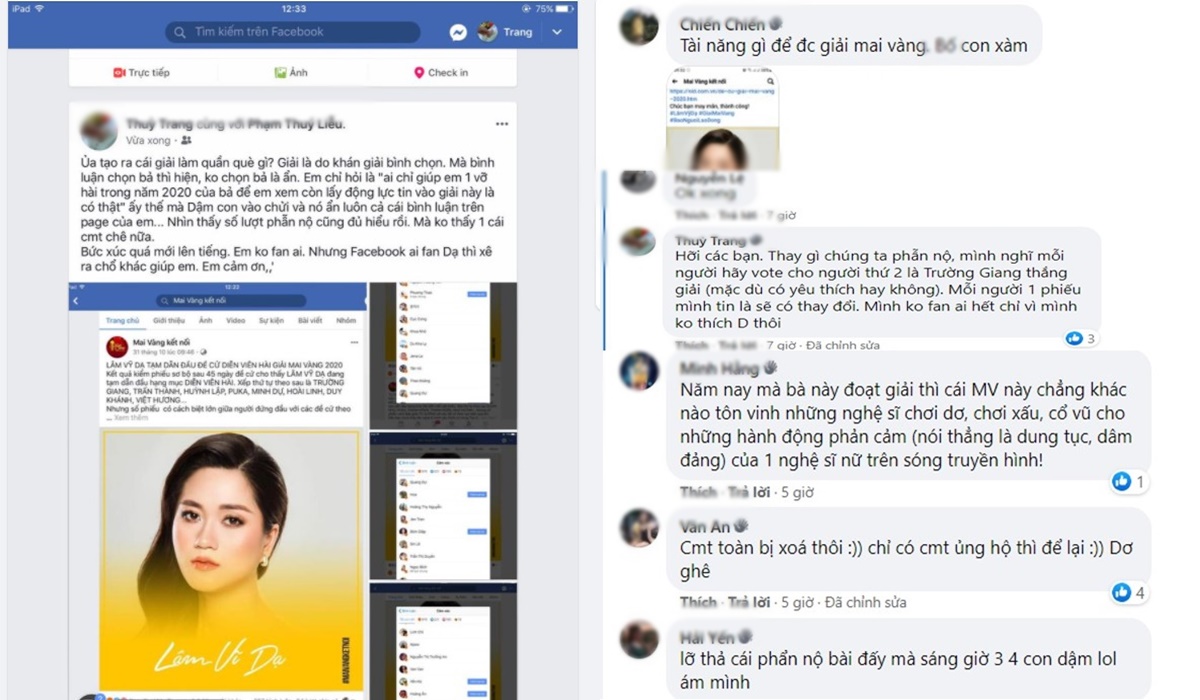 Hiện tại, hàng loạt antifan của Lâm Vỹ Dạ đang kêu gọi thả phẫn nộ vào các bài đăng về Lâm Vỹ Dạ trên trang fanpage Mai Vàng Kết Nối, thậm chí còn có người kêu gọi bình chọn cho Trường Giang - nghệ sĩ đang xếp sau Lâm Vỹ Dạ về số lượng bình chọn.