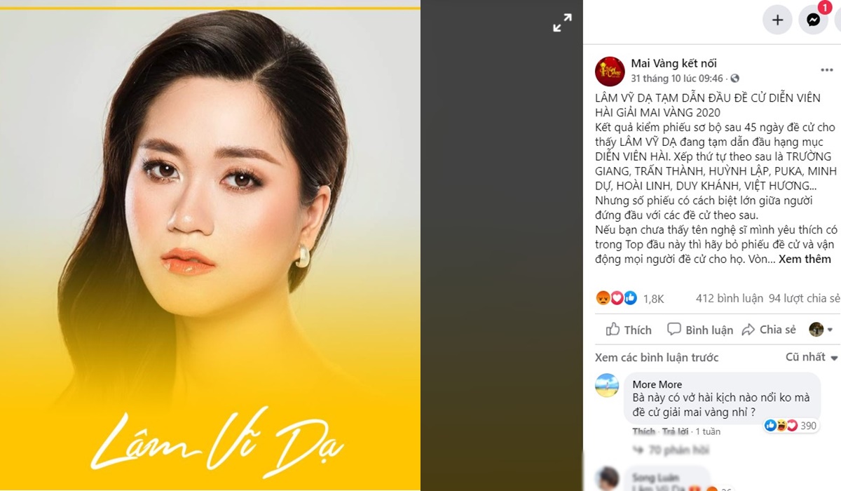 Hiện tại thì Lâm Vỹ Dạ đang tạm dẫn đầu đề cử hạng mục Diễn viên hài của giải Mai Vàng, và vượt xa các đàn anh trong nghề như Trấn Thành, Trường Giang, Hoài Linh.