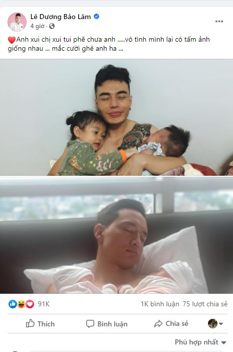 Mới đây, vào ngày 7/11, Lê Dương Bảo Lâm bất ngờ đăng tải hình ảnh thú vị về khoảnh khắc trùng hợp thú vị giữa mình và Kim Lý. Theo đó, nam danh hài đăng tải tấm ảnh mình bế hai con gái trên tay và không quên ghép cùng hình ảnh Kim Lý đang bế cặp song sinh trên tay.