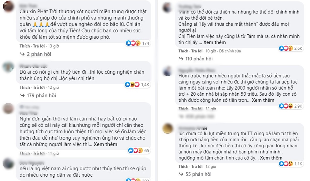 “Lúc chưa có lũ lụt miền trung thì Thủy Tiên cũng đã làm từ thiện khắp nơi bằng tiền của mình rồi. Cần gì ăn chặn mà phải thống kê. Không nói đến tiền thì cô ấy cũng giàu lòng nhân ái hơn mấy đứa ngồi nhà rõ bàn phím như mình. Ngưỡng mộ tấm chân tình của cô ấy.”!