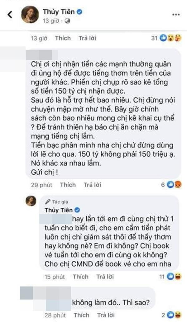 Khi có một tài khoản chất vấn cô về việc công khai thu kê, Thủy Tiên đã sắc sảo đáp trả bằng cách mời người này đi cứu trợ cùng mình để hiểu được nỗi vất vả của công việc mà cô đang làm.