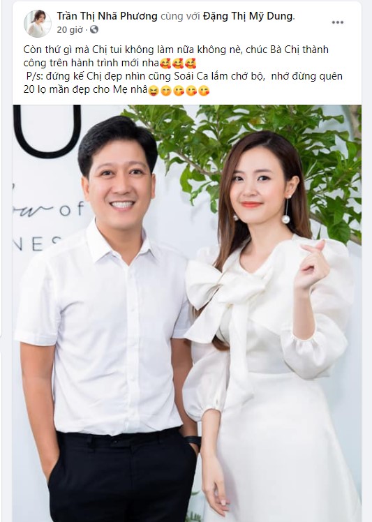 Bà xã Trường Giang còn hào hứng chia sẻ: “Còn thứ gì mà Chị tui không làm nữa không nè, chúc Bà Chị thành công trên hành trình mới nha. P/s: đứng kế Chị đẹp nhìn cũng Soái Ca lắm chớ bộ, nhớ đừng quên 20 lọ mần đẹp cho Mẹ nha."