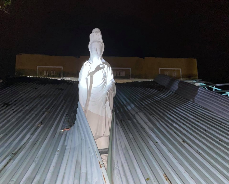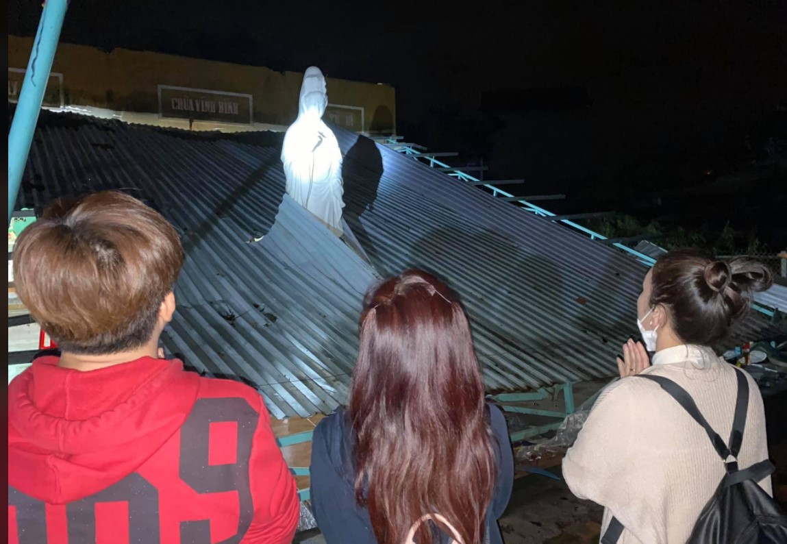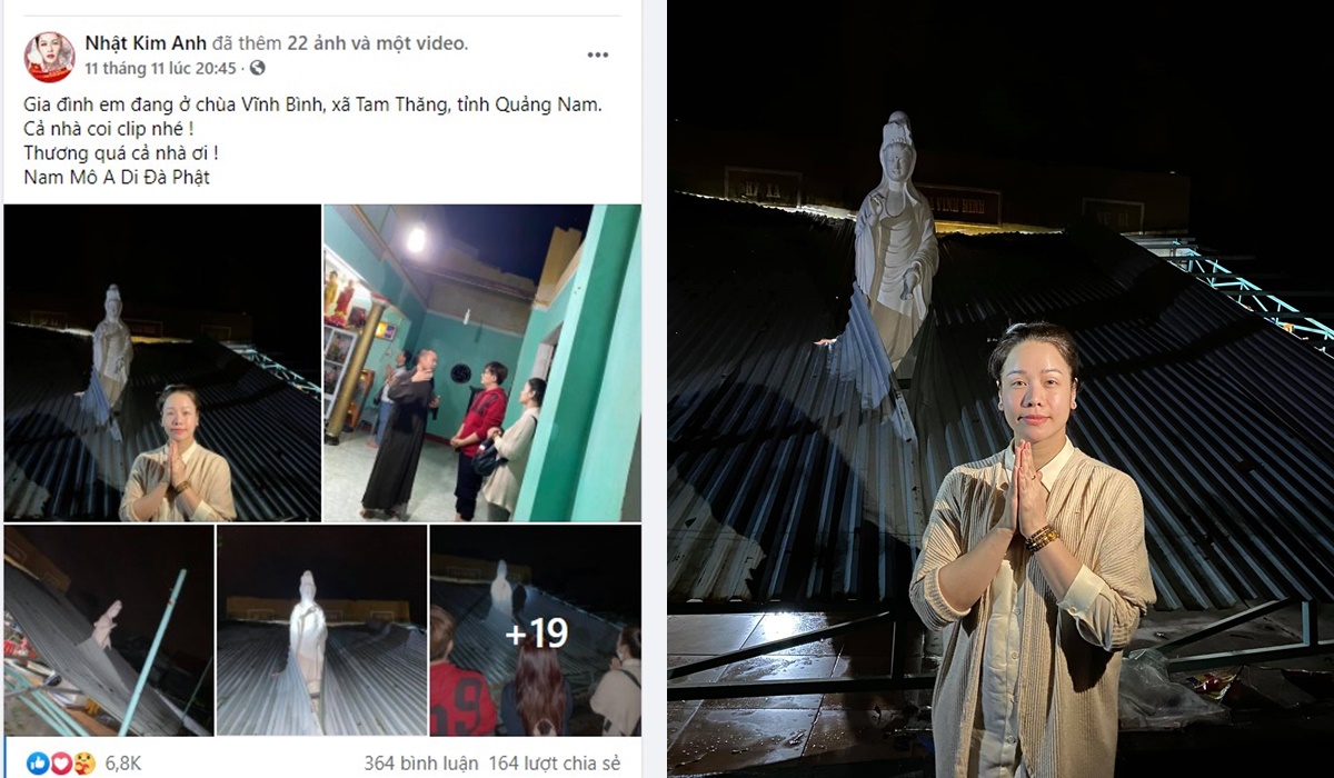 Cụ thể, chùa Vĩnh Bình là một trong những nơi chịu thiệt hại nặng nề của cơn bão vừa qua, điều này đã khiến nhiều hạng mục công trình trong chùa bị tốc mái, đổ sập. Tuy nhiên, điều khiến ai nấy bất ngờ là giữa khung cảnh bộn bề, tan hoang thì, bức tượng Quan Thế Âm Bồ Tát vẫn đứng hiên ngang, không hề bị nghiêng ngả. Chứng kiến cảnh tượng này, nhiều người cho đây là một hiện tượng tâm linh, báo điềm lành, thể hiện sự nhiệm màu của Phật Pháp. Vì vậy mà Nhật Kim Anh cùng MC Đại Nghĩa và các đồng nghiệp dâng hương thành kính, vái lạy, thể hiện sự thành kính trước tượng Quan Thế Âm Bồ Tát.
