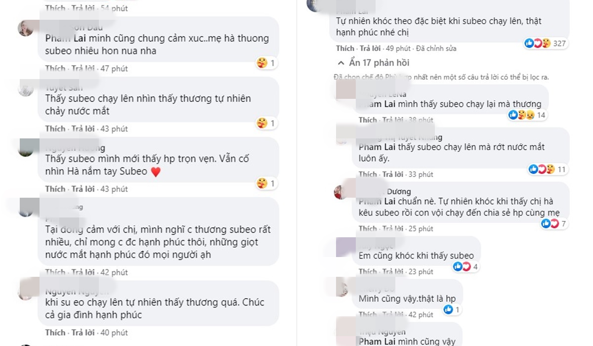 Đáng nói, sau khi Hồ Ngọc Hà nhận lời, Subeo (con trai chung của Hà Hồ với Hồ Ngọc Hà) và mẹ ruột của cô đã chạy đến chúc mừng khoảnh khắc đặc biệt này. Đặc biệt, sau khi Hà Hồ vẫy tay, Subeo đã chạy nhanh tới chỗ mẹ, nắm chặt tay Hà Hồ, đẩy xe em bé vừa sinh và đứng giữa cặp đôi để chụp hình kỷ niệm. Chính giây phút này càng khiến nhiều người xem xúc động đến rơi nước mắt và để lại bình luận: “Tự nhiên khóc theo đặc biệt khi Subeo chạy lên, thật hạnh phúc nhé chị!”, “Mình thấy subeo chạy lại mà thương!”, “Tự nhiên khóc khi thấy chị Hà kêu Subeo rồi con vội chạy đến chia sẻ hạnh phúc cùng mẹ”, “Thấy Subeo mình mới thấy hạnh phúc trọn vẹn. Vẫn cố nhìn Hà nắm tay Subeo.”, “Tại đồng cảm với chị, mình nghĩ c thương Subeo rất nhiều, chỉ mong chị được hạnh phúc thôi, những giọt nước mắt hạnh phúc đó mọi người ạ”....
