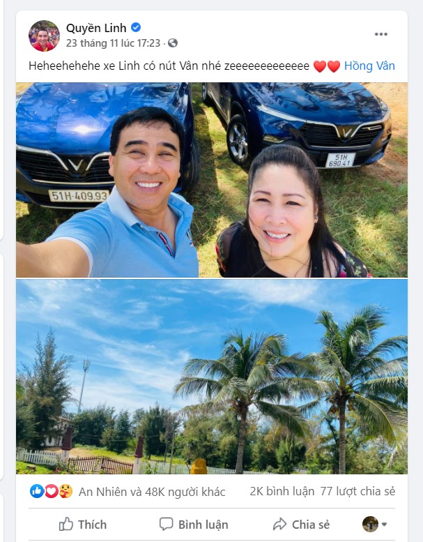 Mới đây, vào ngày 23/11, MC Quyền Linh bất ngờ đăng ảnh cũng NSND Hồng Vân trên trang cá nhân. Điều gây bất ngờ là cả hai xuất hiện bên cạnh hai chiếc xe tiền tỷ đến từ thương hiệu Vinfast.