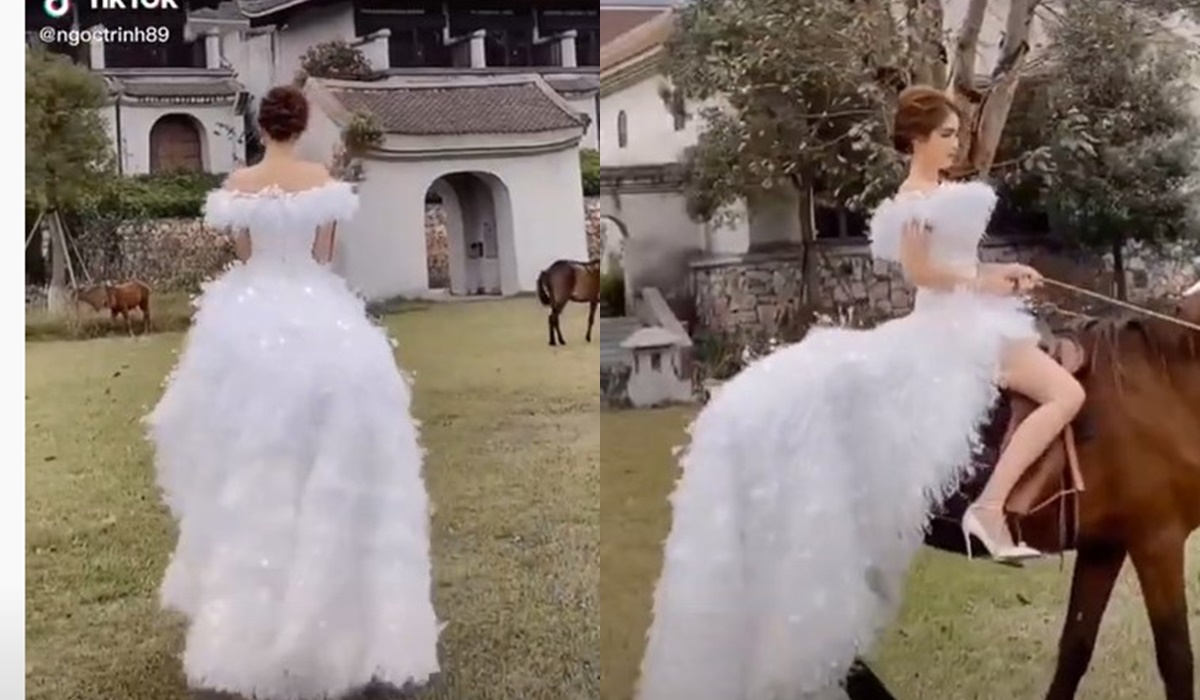 Mới đây,chiều ngày 4/11, Ngọc Trinh đã đăng tải clip cưỡi ngựa trên trang tiktok của mình. Lần này, ‘nữ hoàng nội y’ không còn tạo ra những hành động nhạy cảm, gây nhức mắt người xem mà thay vào đó là một hình ảnh như một công chúa trong bộ váy trắng.
