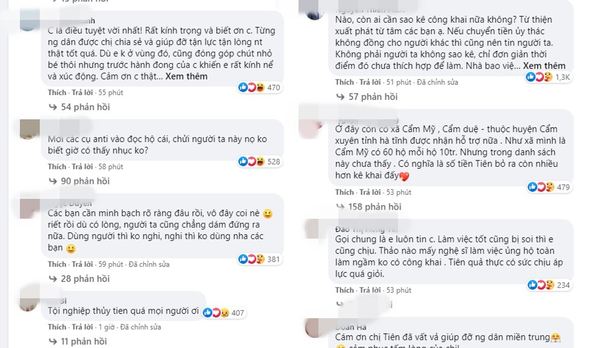 Giờ đây, dưới phần bình luận bình luận của bài viết mà Thủy Tiên đăng tải không còn xuất hiện những bình luận chất vấn, nghi ngờ và chỉ trích mà thay vào đó là những lời khen ngợi, cảm ơn cũng như sự ngưỡng mộ dành cho nữ ca sĩ: