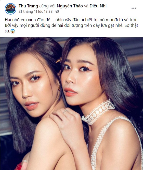 Mới đây, Thu Trang đã đăng tải hình ảnh hai người em thân thiết của mình là Diệu Nhi và Nguyên Thảo lên trang cá nhân. Nữ diễn viên hài cũng không quên trêu chọc đàn em với một dòng trạng thái đầy hài hước: “Hai nhỏ em xinh đáo để ... nhìn vậy đâu ai biết tụi nó mới đi tù về trời. Bởi vậy mọi người đừng để hai đối tượng trên đây lừa gạt nhé. Sợ thật sự!”.