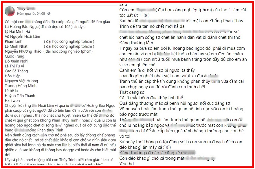 Tài khoản của cô gái đăng tải câu chuyện bịa đặt về mối quan hệ của Hoài Lâm và Bảo Ngọc khi. Cụ thể người này cho rằng Hoài Lâm đã phải ‘cướp của giết người’ để cưới Bảo Ngọc, thậm chí còn dùng những từ tục tĩu để ‘phỉ báng’ Bảo Ngọc, nguyền rủa cô bị bệnh.Khi đọc bài viết, ai cũng biết đây là câu chuyện được người này bịa đặt để hạ bệ nghệ sĩ.