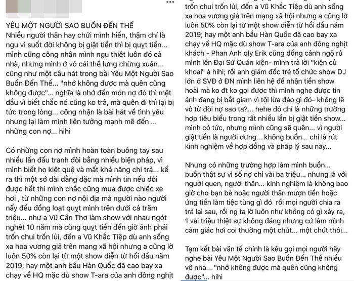 Như anh Vũ Cần Thơ làm show với nhau ngót nghét 10 năm mà cũng quỵt tiền đến giờ ảnh phải trốn chui trốn lủi, đến anh Vũ Khắc Tiệp dù anh sống xa hoa vương giả trên mạng xã hội nhưng anh cũng lờ luôn 50% còn lại từ một show diễn từ hồi đầu năm 2019; hay một anh bầu Hàn Quốc đã cao bay xa chạy về HQ mặc dù show T-ara của anh đông nghịt khách - Phan Anh quản lý Erik cũng đồng cảnh ngộ rủ mình lên Đại Sứ Quán kiện - mình trả lời "kiện củ khoai"à. Rồi anh giám đốc trẻ tổ chức show DJ lớn ở SVĐ ở ĐN mình liên hệ để nhận tiền show hoài mà điện thoại không gọi được thì mình nghe được tin ảnh đang bị bắt giam vì tội lừa đảo gì đó - không lẽ vô tù đòi nợ sao ta?...
