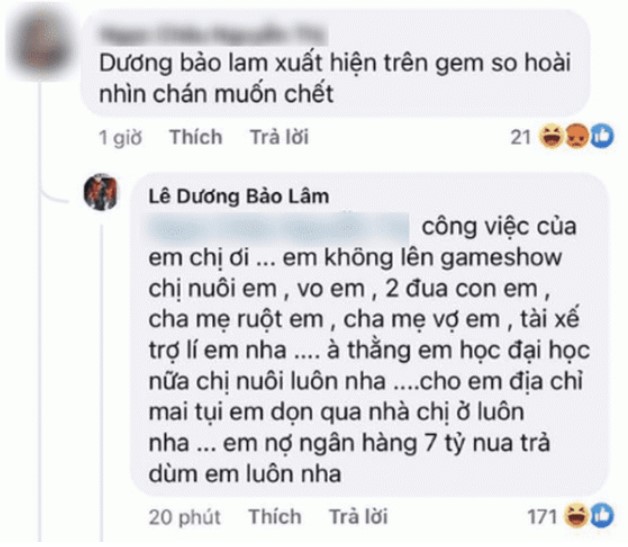 Tuy vậy, anh cũng gặp không ít những ý kiến chỉ trích cho rằng anh xuất hiện liên tục trên gameshow, gây nhàm chán. Mới đây, vào ngày 22/11, Lê Dương Bảo Lâm bất ngờ đáp trả một ý kiến vô lý về việc khuyên anh đừng xuất hiện trên truyền hình nữa. "Công việc của em chị ơi, em không lên gameshow thì chị nuôi vợ em, 2 đứa con em, cha mẹ ruột em, cha mẹ vợ em, tài xế, trợ lý và em trai đang học Đại học chị nuôi luôn nha. Cho em địa chỉ, mai tụi em dọn qua nhà chị ở luôn" - Lê Dương Bảo Lâm không ngại trả lời một cách thẳng thắn.