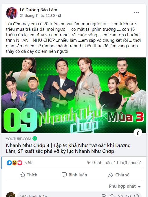 Nam diễn viên cùng nhanh chóng tiết lộ cách sử dụng số tiền này trên trang cá nhân: “Tối đêm nay em có 20 triệu em vui lắm mọi người ơi .... em trích ra 5 triệu mua trà sữa đãi mọi người ....có mặt tại phim trường .... còn 15 triệu còn lại em đưa vợ em trang trải cuộc sống ... em cảm ơn chương trình NHANH NHƯ CHỚP ..nhiều lắm ....em sắp vô chung kết rồi ... thời gian sắp tới em sẽ ráng học hành trang bị kiến thức để làm vang danh thầy cô đã dạy dỗ em nên người”.
