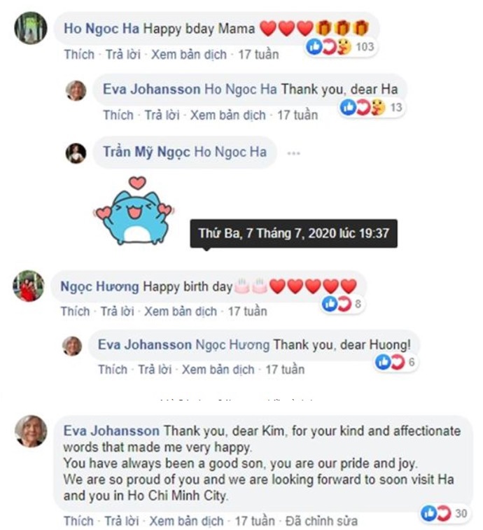 Vào hồi đầu tháng 7, nữ ca sĩ cũng công khai trò chuyện vui vẻ với ‘mẹ chồng’ trên mạng xã hội, thậm chí Hà Hồ còn chia sẻ mẹ Kim Lý rất thích và thường xuyên nghe sản phẩm mới của mình. ‘Nữ hoàng giải trí’ cũng bình luận vào bài viết Kim Lý chúc mừng sinh nhật mẹ và còn gọi là mẹ thân mật đầy thân mật. Sau đó, mẹ Kim Lý cũng cảm ơn ‘con dâu’ và hứa sẽ sớm về Việt Nam để thăm cô, ở thời điểm đó Hà Hồ đang ở những tháng giữa của thai kỳ.