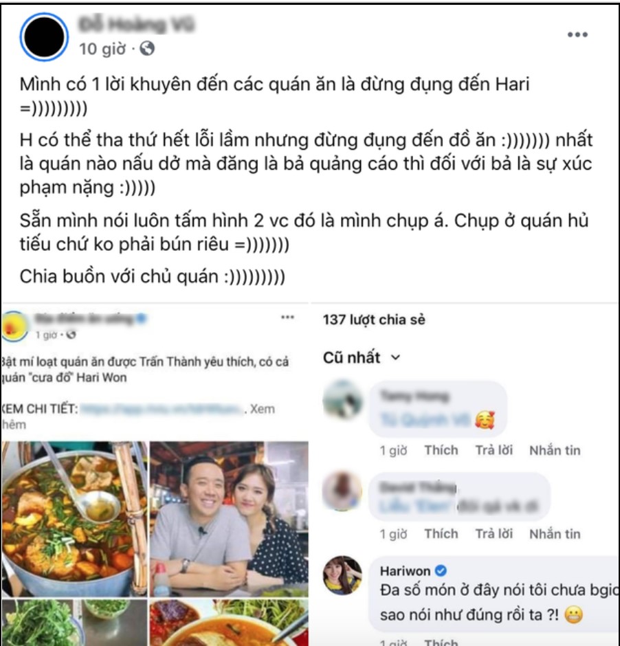 Mơi đây, trên một trang fanpage nổi tiếng về các địa điểm ăn uống đã đăng tải bài viết có tiêu đề: "Bật mí loạt quán ăn được Trấn Thành yêu thích, có cả quán ‘cưa đổ’ Hari Won". Đi kèm với đó là danh sách hàng loạt quán ăn nổi tiếng ở Sài Gòn. Để tăng thêm phần chú ý cho bài viết, trang này còn đính kèm hình ảnh Hari Won và Trấn Thành đi ăn cùng nhau.