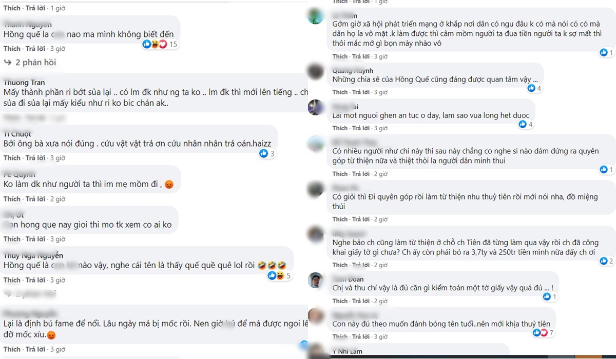 “Có nhiều người như chị này thi sau này chẳng co nghệ sĩ nào dám đứng ra quyên góp từ thiện nữa và thiệt thòi là người dân mình thui!”
