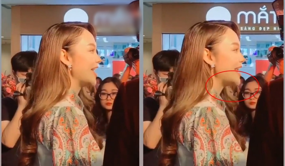 Theo đó, nếu nhìn ở góc máy chính diện thì gương mặt của Minh Hằng vẫn rất cân đối và ưa nhìn. Tuy nhiên, khi ở góc chụp nghiêng thì thấy rõ chiếc cằm nhọn hoắt, đặc biệt khi cười chiếc cằm của Minh Hằng trở nên không cân đối với gương mặt.